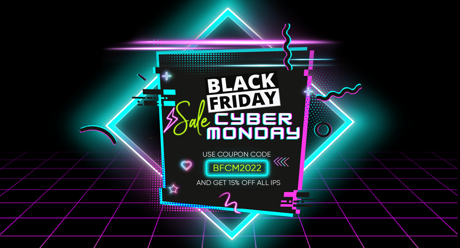 A BFCM Neon party is an exceptional sales deal that we are offering for our valued customers and partners. This year, for a limited time only, we're offering a 15% discount on all new IP address orders!